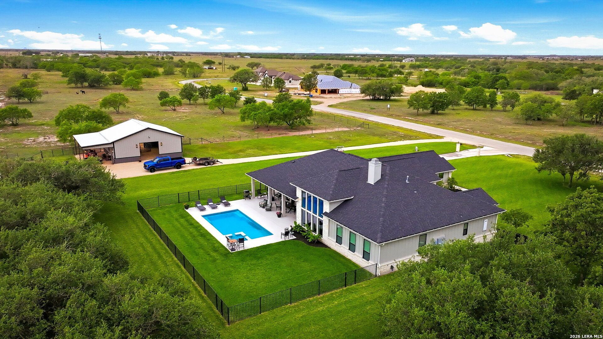 Built in 2022 & designed by Steve Klein Custom Homes, this turnkey ranchette sits on 5.01 acres in Victoria County-just 12 minutes from Victoria, 40 minutes from the Texas coastline & 2 hours to San Antonio & Houston. The property offers a seamless blend of refined living & equestrian lifestyle, with the beautifully landscaped home lined with mature, well-maintained oak trees set to the left & open acreage to the right, providing ample space for horses to roam. The property is cross-fenced, & the fully landscaped homestead features irrigation, creating a setting where shoes are optional. A secondary driveway leads to a 1,200-square-foot insulated metal workshop with electricity, currently configured as an equestrian retreat with two horse stalls. The building includes two pass-through roll-up doors & an attached covered carport, ideal for storing a boat, tractor, or ATV-and can be easily adapted to suit a variety of needs & lifestyles. Inside, the home offers 3,496 square feet of well-designed, open-concept living space. Vaulted ceilings & large windows bring in plenty of natural light, giving the home a bright, welcoming feel throughout. The layout includes a spacious main living area that flows seamlessly into the kitchen. The kitchen is designed for both everyday use & entertaining, featuring a large center island that comfortably seats six. Stainless steel built-in appliances, a gas cooktop, abundant cabinetry, & generous counter space provide both function & convenience. A cozy fireplace anchors the living space, perfect for cooler Texas evenings. The owners retreat is a private getaway, featuring coffered ceilings with exposed beams & direct access to the covered patio & pool. The en-suite bath offers a beautifully designed walk-in shower, separate vanities, & a spacious walk-in closet with built-in dresser & additional storage. Outside, the fully fenced pool provides a great place to relax & unwind during the warmer months, complete with a water feature & lighting. The covered patio extends the living space outdoors with a built-in TV, speakers, & ceiling fan-making it an easy spot to enjoy county living year-round. Off the 3-car garage, youll find a practical mud & laundry room that adds everyday functionality & keeps things organized. Additional features include an aerobic septic system & Culligan water softener. Gently lived in & very well maintained, the home reflects pride of ownership & offers a comfortable blend of modern convenience & relaxed country living. This property is thoughtfully designed with everything you need already in place. All thats left is to move in & make it your own.