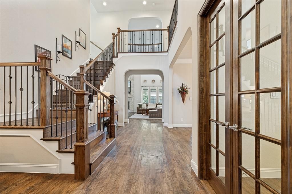 Experience elevated living in this impeccably maintained Frisco residence, SHOWCASING OVER $75K IN THOUGHTFUL UPGRADES (see transaction doc. for list) and true pride of ownership throughout. Ideally located within the award winning Frisco ISD and zoned to highly sought-after, FIVE STAR RATED SCHOOLS, this home blends luxury, functionality, and everyday convenience. A grand entry welcomes you with vaulted ceilings and abundant natural light, setting a dramatic and inviting tone. The main living area is anchored by a stunning floor to ceiling stone fireplace, creating a sophisticated focal point that adds both warmth and elegance. Designed for entertaining and daily living, the open-concept layout connects the family room to a well appointed chef's kitchen featuring generous counter space, double ovens, a walk-in pantry, Butler's Pantry and seamless flow for hosting or relaxing. Rich wood flooring (REAL HW) spans the downstairs, completed by plantation shutters throughout for timeless style and privacy. The thoughtful floor plan includes 2 bedrooms on the main level and a dedicated private office-ideal for work or guests The primary suite is a serene retreat, with an oversized seamless glass shower, dual vanities and separate his-and-her closets, offering both luxury and practicality. Step outside to a beautifully landscaped backyard with mature trees and custom stone like patio. Designed with flexibility in mind, the extended patio allows for easy reconfiguration should a future owner desire a pool. Perfectly positioned in a premier Frisco location, the home offers convenient access to PGA Frisco, along with nearby shopping and essentials at HEB and Whole Food Market. A rare turnkey opportunity combining refined finishes, thoughtfully design, and an exceptional location in the heart of Frisco.