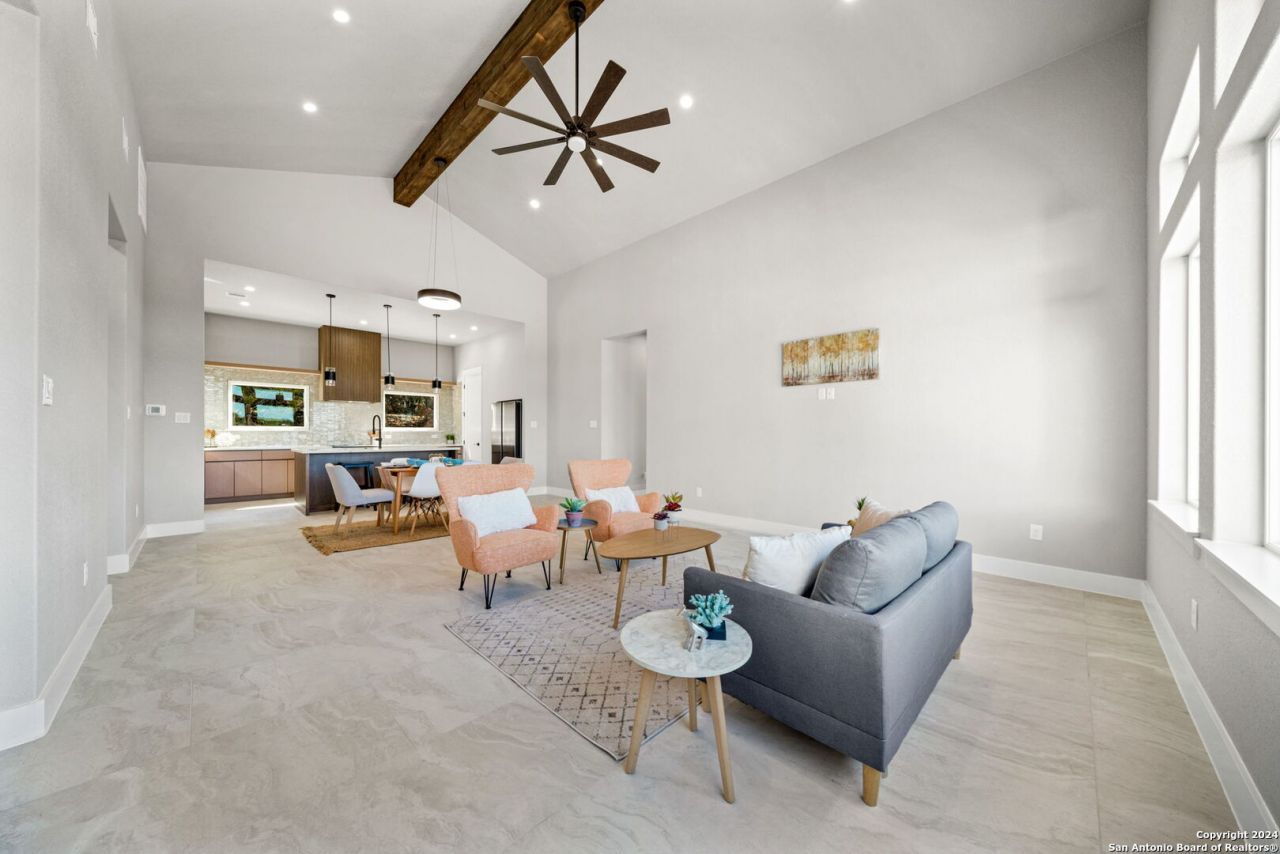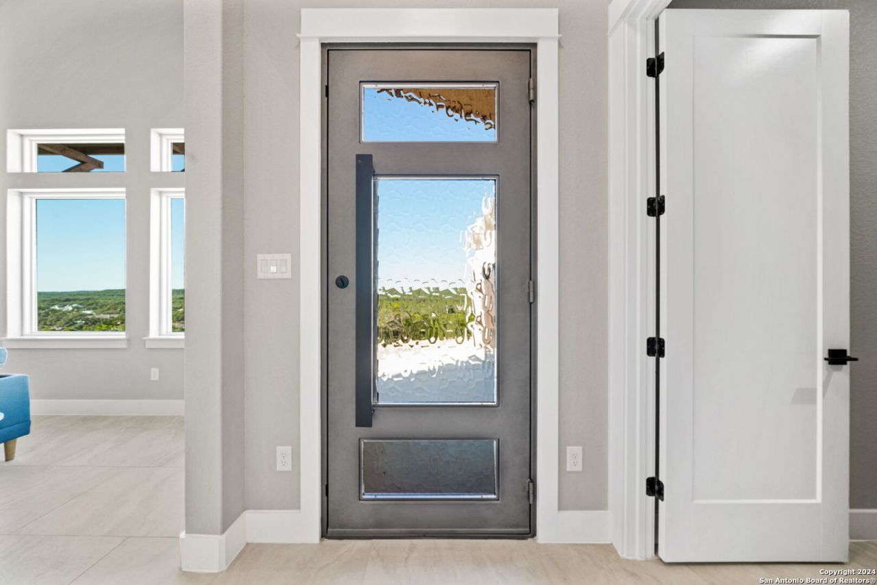 *Priced well below county valuation of $635,620!* This brand new luxury custom home was thoughtfully designed by a professional architect and custom builder, ReForm Design and Build, for this specific lot, taking full advantage of its high vantage point and incredible Texas Hill Country views. A modern iron front door opens to a true entry, leading guests into the great room, which boasts tall, vaulted ceilings and north-facing Pella picture and transom windows to capitalize on the sweeping views and fabulous natural light. The house was designed with a northern-facing side porch that catches sunsets beautifully and further makes the most of the incredible views. The u-shaped island kitchen features quartz counters, Samsung appliances, and thoughtful designer details such as pop-up power outlets and a fun tiled feature corner. A huge walk-in pantry just adds to your storage options! The split floor plan has the owners suite tucked privately away, with double doors leading to the spa-like bathroom, complete with oversized walk-in textured-tile shower and floating double vanity. The generously-sized secondary bedrooms both feature interesting ceiling designs and share a private jack & jill bathroom that is accessible only through the bedrooms, and the half bath is perfect for visiting guests. Luxury features not often found at this price point include fabulous Pella crank casement energy star windows in bedrooms to enjoy that fabulous Hill County breeze, face-framed wooden closet & built-in shelving, floating vanities in all bathrooms, wall mount tv preps, radiant barrier, water softener loop, and extensive tile work. The true laundry room features cabinet storage and a folding area. Extra durable porcelain tile flooring lends a cohesive feel throughout the space. The sand-finish stucco exterior, thoughtfully placed windows, and varied metal roof lines all lend to a stylish, modern design. The swing-in driveway provides additional pad parking space as well. Oversized two car garage with outdoor access. No city taxes and builder warranty! First two photos are renderings of what the property could look like after landscaping.