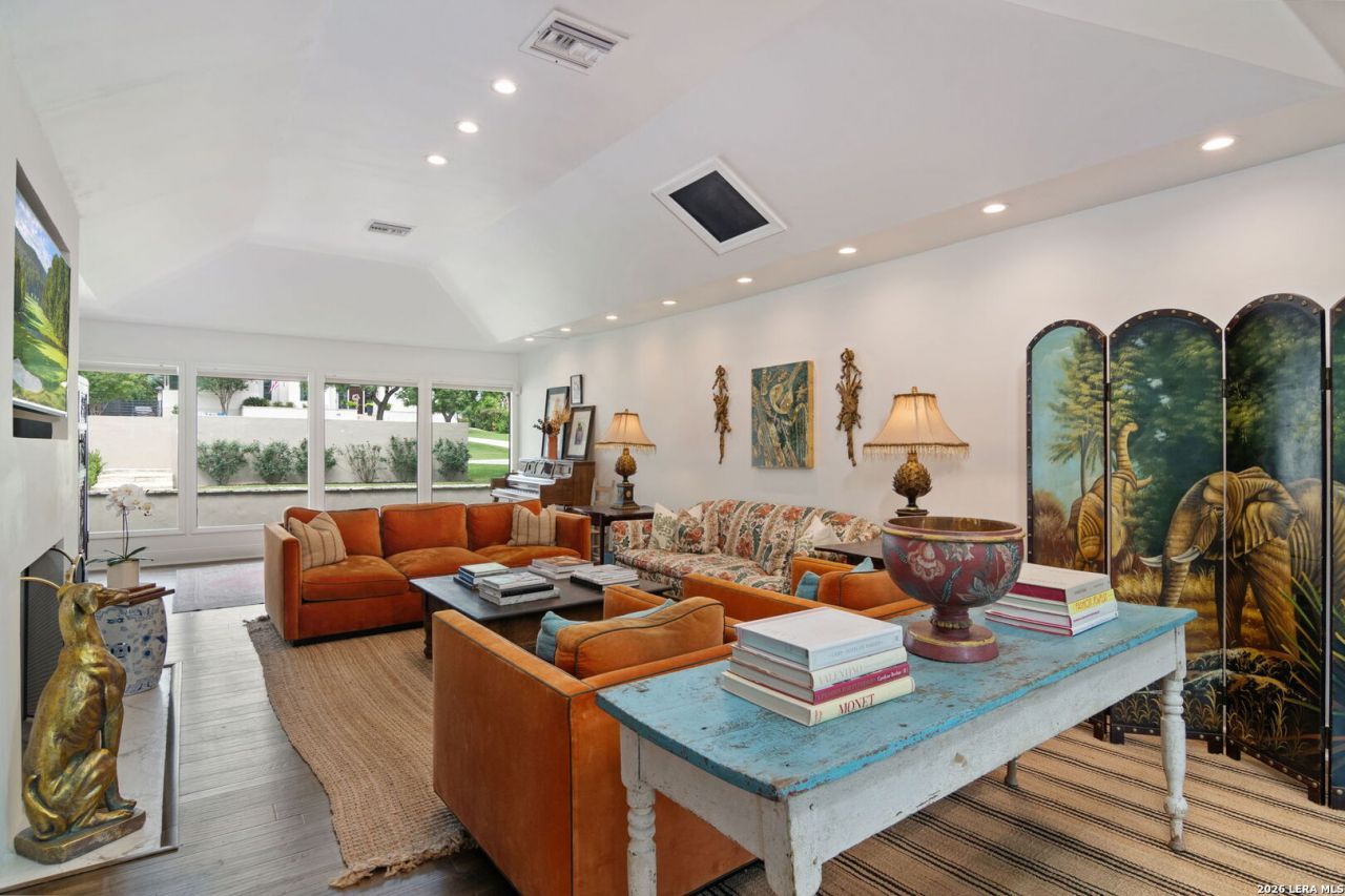 A beautifully updated Terrell Hills home offering privacy, flexibility, and effortless living in AHISD. Move-in ready and reimagined in a Spanish transitional, ranch-style aesthetic, this residence blends timeless character with modern upgrades on a grand, established block. Thoughtful landscaping and a substantial partial front wall create privacy with a refined street presence, while the setting itself offers a rare sense of scale and quiet within one of the areas most desirable streets. Inside, abundant natural light defines the home. Walls of windows frame serene, tree-filled views, creating a sense of calm and connection to the outdoors throughout. The second floor offers a unique treetop perspective, enhancing the homes tranquil, elevated feel. Light-filled living and dining spaces flow seamlessly, designed for both everyday living and entertaining. A dedicated bar area enhances the homes hosting appeal. The chefs kitchen features Sub-Zero appliances, a Jenn-Air 6 burner gas range with double oven, and generous prep and storage, all integrated into the heart of the home. The first-floor primary suite offers a private retreat with a fully renovated closet and a spacious bath with soaking spa tub, steam shower, and double marble vanities. Upstairs, two large bedrooms connected by a Jack and Jill bath provide separation and flexibility for family, guests, or workspace. Recent updates include new flooring, tilework, interior paint, updated stucco and exterior finishes, and a new roof. Recessed dimmable lighting, gas fireplace with wood-burning capability, and a dedicated laundry and mudroom add to the homes functionality. The garage has been expanded to accommodate two vehicles. The large, private backyard features mature trees and evergreen turf, offering immediate enjoyment and low-maintenance. Located within the Alamo Heights ISD and minutes from the airport and the Pearl, this home offers a rare combination of natural beauty, thoughtful updates, and everyday convenience.