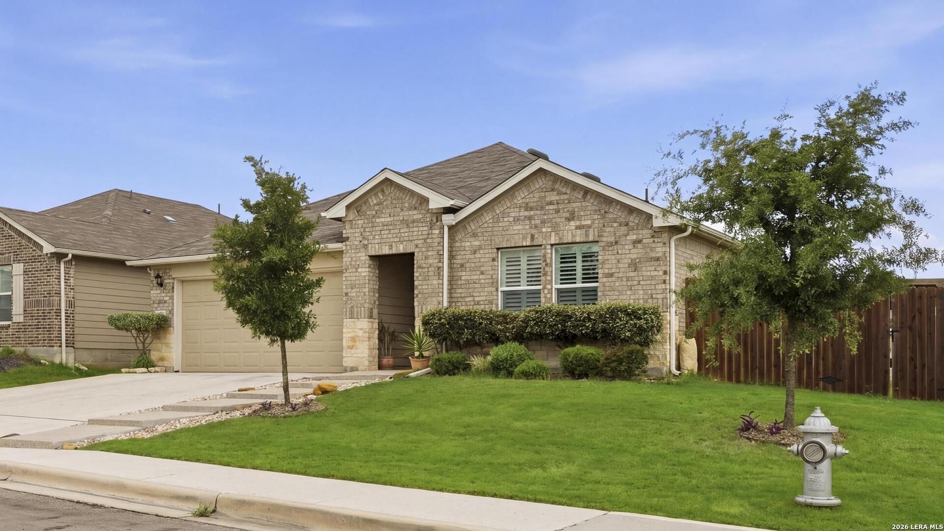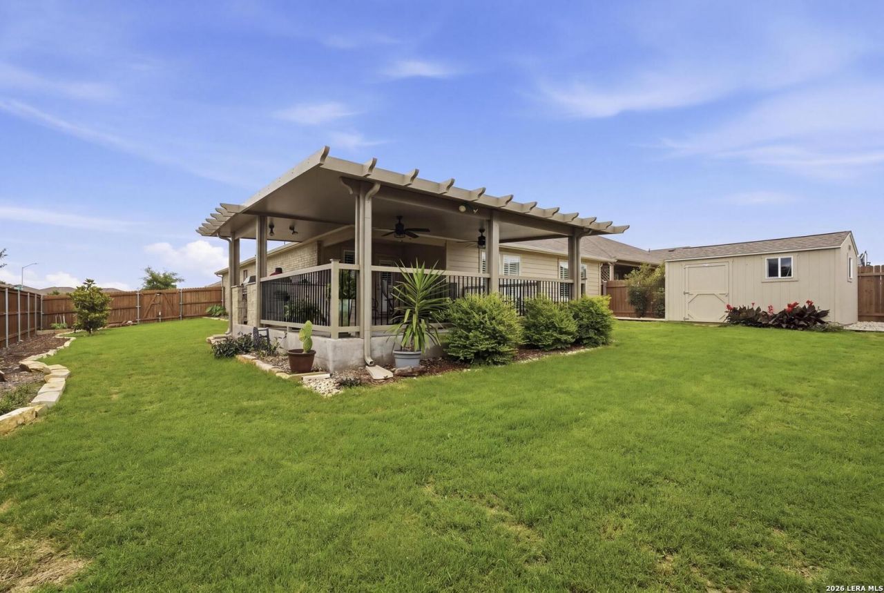 Loaded with updates!! This very well-maintained 4-bedroom single-story home with 3-side brick/stone exterior sits on an oversized .24-acre corner lot in Arroyo Ranch. Built for entertaining and easy outdoor living, the 21 x 24 Oasis Santa Fe Package covered patio with railing, outdoor kitchen, and epoxy overlay flooring - along with the extended fence line for added backyard privacy and space, professional landscaping, and a 10 x 13 Tuff Shed on a concrete slab - creates a backyard oasis all its own!! Inside, the open floor plan offers a designer kitchen with granite counters, open to a single living and breakfast area, plus plantation shutters throughout! Additional updates include an added concrete step entry walk and finished garage, both with epoxy overlay. Move-in ready with upgrades that truly set this home apart! Additional details in associated docs.